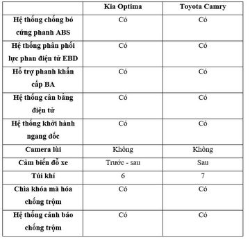 Tính năng an toàn trên 2 xe cũng khá tương đương. Toyota Camry nhiều hơn 1 túi khí nhưng đổi lại, Kia Optima lại được trang bị cảm biến đỗ xe trước – sau, trong khi Camry chỉ có cảm biến đỗ xe phía sau: