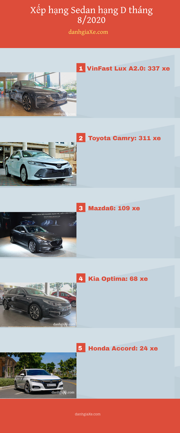 Nhìn chung doanh số của tất cả các mẫu sedan hạng D trong tháng này đều bị sụt giảm do tâm lý kiêng mua hàng tháng Ngâu và ảnh hưởng của dịch CoVid-19. Tuy nhiên Camry là mẫu có mức sụt giảm cao nhất, từ 448 chiếc trong tháng liền trước xuống còn 311 xe. VinFast Lux A2.0 cũng sụt giảm nhưng con số ít hơn nhiều, từ 355 chiếc trong tháng liền trước xuống còn 337 chiếc trong tháng này.