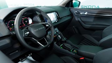 Karoq Sportline trang bị sạc không dây và kết nối Carplay, Android Auto không dây kết hợp với hệ thống âm thanh vòm 10 loa Canton cao cấp, công suất lên tới 615 w cho trải nghiệm giải trí đỉnh cao. Xe cũng được trang bị cửa sổ trời, trong đó bao gồm 03 màu theo phong cách Metalic ánh kim là Red Velvet (đỏ), Graphite Grey (xám) và Magic Black (đen), cùng 01 màu duy nhất theo hướng Solid - đơn sắc, tối giản Steel Grey.