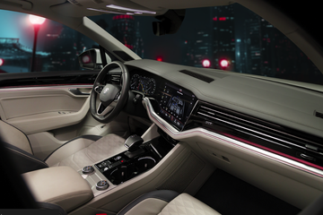 Ghế trên xe bọc da, đục lỗ thông hơi, cửa sổ trời toàn cảnh, đèn viền nội thất 30 màu… và hàng dài tiện nghi khác đi kèm. Hành trình di chuyển cùng với Touareg, vì thế, luôn đi kèm sự êm ái, thư giãn và đẳng cấp.