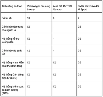 Về tính năng an toàn, Volkswagen Touareg tiếp tục dẫn đầu với số lượng túi khí đến 10 và các trang bị ngang ngửa với mẫu xe có giá bán cao nhất là BMW X5 trong khi vẫn nhỉnh hơn đôi chút so với Audi Q7.