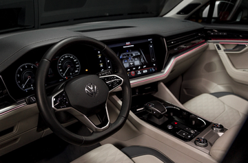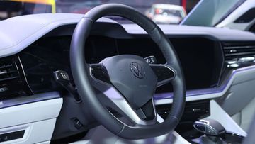 Vô lăng Volkswagen Touareg cũng tạo cảm hứng cho người lái qua thiết kế D-cut vát đáy, bọc da tích hợp sưởi. Ngoài ra, cả hai phiên bản được trang bị vô lăng tích hợp điều khiển âm thanh, điều khiển giọng nói, lẫy chuyển số, điều khiển hành trình, chỉnh điện và nhớ vị trí vô lăng.