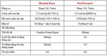 Cùng sử dụng động cơ xăng với công nghệ tăng áp, tuy nhiên với dung tích lớn hơn nên động cơ trên Hyundai Kona cho sức mạnh vượt trội hơn 50 mã lực và 95 Nm. Ngoài ra, hộp số trên Kona cũng hiện đại hơn với loại 7 cấp ly hợp kép, có 3 chế độ lái, còn trên Ford EcoSport chỉ là loại tự động 6 cấp thông thường.