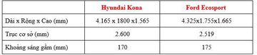 Xét về kích thước tổng thể, khi đặt 2 xe cạnh nhau ta sẽ thấy Kona nhỉnh hơn đôi chút về chiều dài cơ sở, giúp đảm bảo hơn sự thoải mái trong khoang nội thất so với EcoSport. Tuy nhiên mẫu SUV cỡ nhỏ đến từ Mỹ lại có khoảng sáng gầm cao hơn đôi chút, giúp mang lại khả năng leo lề và vận hành trên điều kiện địa hình gồ ghề tốt hơn.