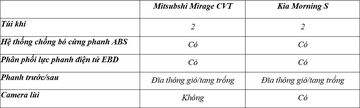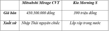 Mitsubishi Mirage lợi thế hơn về xuất xứ khi được nhập nguyên chiếc từ Thái, trong khi Kia Morning là hàng lắp ráp trong nước, độ bền và chất lượng khó sánh bằng. Đổi lại, mẫu xe đến từ Hàn có giá bán cạnh tranh hơn khi rẻ hơn 60 triệu rưỡi.
