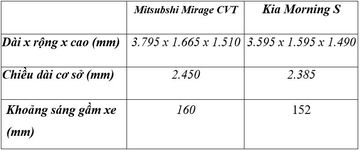 Thuộc 2 phân khúc khác nhau nhưng với tầm giá và, thiết kế và các trang bị tương đương nhau nên không có gì lạ khi Mirage và Morning thường được đem ra so sánh, cân nhắc đối với những khách hàng có nhu cầu mua xe đô thị cỡ nhỏ trong tầm tiền khoảng 500 triệu đồng. Một vài so sánh nhanh về thông số kỹ thuật giữa 2 mẫu xe này trong bài viết dưới đây sẽ giúp bạn dễ dàng hơn trong việc đưa ra quyết định cuối cùng: Kia Morning hay Mitsubishi Mirage?