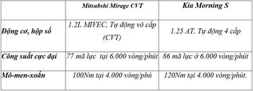 Kia Morning mạnh hơn 9 mã lực. Tuy nhiên Mitsubishi Mirage được trang bị hộp số CVT, cho cảm giác chuyển số mượt và êm hơn so với loại số tự động trên Kia Morning