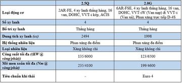 Tại Việt Nam, Camry 2019 vẫn tiếp tục sử dụng động cơ cũ với sức mạnh mã lực và mô-men-xoắn trên 2 bản như sau: