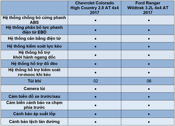 Sau khi nỗ lực nâng cấp, Chevrolet Colorado đã tiến sát đến Ford Ranger ở hạng mục an toàn khi chỉ còn thua kém về số túi khí. Những công nghệ hỗ trợ vốn trước đây chỉ “độc quyền” ở Wildtrak nay cũng đã xuất hiện ở High Country, chẳng hạn như cảnh báo lệch làn đường hay cảnh báo áp suất lốp. Tất cả sẽ giúp bạn an toàn và tự tin hoàn toàn khi đồng hành cùng hai chiếc bán tải này, dù ở bất kì nơi đâu.