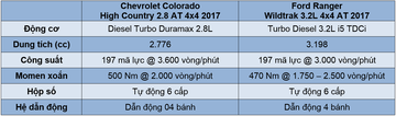 Không quá ngạc nhiên khi bảng so sánh hiệu năng lại chứa đựng nhiều công suất và mô-men xoắn như hiện tại, bởi lẽ High Country cùng Wildtrak 3.2L lần lượt là hai chiếc bán tải mạnh nhất nhì phân khúc. Kết hợp cùng hai khối cơ bắp đáng nể này là hộp số tự động 6 cấp và hệ dẫn động hai cầu với nút gài cầu điện.