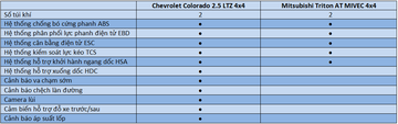 Mitsubishi Triton có giá bán hấp dẫn hơn, thiết kế nhỏ gọn di chuyển linh hoạt trong thành phố, hàng ghế thứ hai thoải mái kể cả khi đi xa và thùng hàng rộng rãi chuyên chở. Kết hợp với động cơ MIVEC cho khả năng vận hành mạnh mẽ, đây là lựa chọn thích hợp cho những ai yêu cảm giác lái, thường chở gia đình nhiều người hoặc kinh doanh vận tải hàng hóa. Trong khi đó, Colorado LTZ với chất Mỹ lại hướng đến các khách hàng nam tính, mạnh mẽ, đề cao tính công nghệ và an toàn của xe.