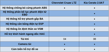 Một lần nữa Kia Cerato 2017 lại vượt trội hơn hẵn đối thủ với đầy đủ các tính năng an toàn, trong khi Chevy Cruze 2017 chỉ được trang bị an toàn nhỉnh hơn những mẫu xe hạng B.