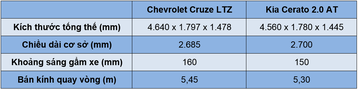 Xét về thông số kích thước ảnh hưởng đến sự di chuyển, cũng như không gian nội thất bên trong xe, thì có thể thấy Cruze 2017 trông “bề thế” nhờ sở hữu kích thước tổng thể lớn và có gầm xe cao hơn đối thủ 10mm. Bù lại, Kia Cerato lại nhỉnh hơn với chiều dài cơ sở 2700mm, đồng thời bán kính quay vòng 5,3 m giúp mẫu xe Hàn dễ dàng di chuyển trong phố.