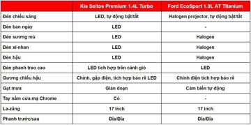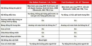 Để có được cái nhìn khách quan nhất, chúng tôi đưa lên bàn cân hai phiên bản cao cấp nhất của hai dòng xe là Kia Seltos Premium 1.4L Turbo và Ford EcoSport 1.0L AT Titanium. Hai dòng xe “Full-option” hội tụ đầy đủ những công nghệ và trang bị hàng đầu sẽ giúp chúng ta có được cái nhìn tổng quan từ kích thước, trang bị nội ngoại thất, cho đến khả năng vận hành khác biệt giữa hai dòng xe, từ cho có cho mình lựa chọn đáng cân nhắc.