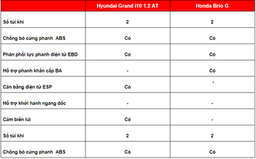Mặc dù có giá bán thấp hơn nhưng i10 lại sở hữu danh sách trang bị an toàn tốt hơn khi được trang bị cảm biến lùi, hỗ trợ người lái nhàn hơn khi lùi, đỗ xe, phanh khẩn cấp BA và đặc biệt là cân bằng điện tử - một tính năng an toàn khá hiếm ở các dòng xe cùng phân khúc. Honda Brio G có tính năng hỗ trợ phanh khẩn cấp BA, khoá cửa tự động khi xe chạy, phù hợp với những khách hàng nữ giới sử dụng xe chở con nhỏ.