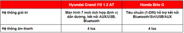 Lợi thế tiếp tục nghiêng về Hyundai Grand i10 1.2 AT bởi trên xe được trang bị màn hình 7 inch tích hợp định vị dẫn đường phiên bản Việt, rất tiện lợi trong việc tìm đường sá. Xe được hỗ trợ kết nối AUX/USB, Bluetooth. Trong khi đó trên Honda Brio G dùng màn hình tiêu chuẩn 1-DIN hỗ trợ kết nối Bluetooth/Siri/USB/AUX. Hệ thống âm thanh trên 2 xe đều bao gồm 4 loa.