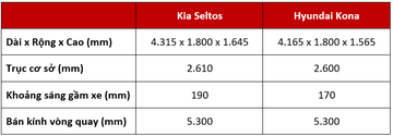 Về kích thước, Kia Seltos hoàn toàn vượt trội so với Hyundai Kona khi dài hơn đến 150 mm và cao hơn 80 mm. Đặc biệt, chiều dài trục cơ sở của Seltos lớn hơn 10 mm so với Kona, mang đến khoảng để chân thoải mái hơn cho cả hai hàng ghế. Bán kính quay vòng trên cả hai mẫu xe đều đạt mức 5.3 m, mang đến khả năng xoay sở tốt trong môi trường đô thị. Con số này tương đương với Ecosport và tốt hơn nhiều so với mẫu xe đắt tiền nhất phân khúc là Honda HR-V (5.7 m).