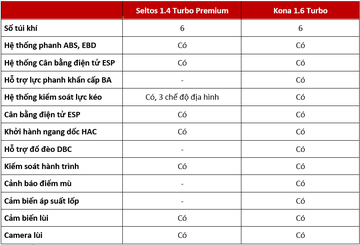 Về trang bị an toàn, cả hai mẫu xe đều sở hữu đầy đủ các công nghệ an toàn phổ biến nhất. Seltos Premium vượt trội hơn với hệ thống kiểm soát lực kéo tích hợp 3 chế độ địa hình và 3 chế độ lái riêng biệt. Trong khi đó, Kona Turbo lại nhỉnh hơn với Cảnh báo
