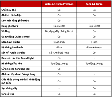 Về mặt trang bị, cả 2 xe đều sở hữu chuẩn tương thích Apple CarPlay nhưng Seltos 1.4 Premium có lợi thế lớn hơn với màn hình kích thước 10.25 inch (trên Kona 1.6 là 8 inch). Bên cạnh đó, cửa gió điều hoà cho hàng ghế sau là trang bị độc quyền trong phân khúc của Seltos, mang đến khả năng làm lạnh nhanh và đều hơn đến tất cả các vị trí trên xe.