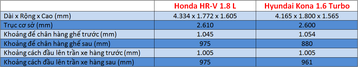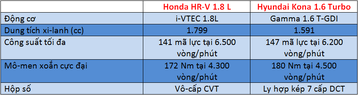 Honda HR-V và Hyundai Kona là hai tân binh vừa gia nhập phân khúc SUV cỡ nhỏ tại thị trường Việt Nam. Đại diện từ Nhật Bản hiện có 2 phiên bản, giá bán từ 786 - 871 triệu đồng, nhập khẩu trực tiếp từ Thái Lan. Trong khi đó đối thủ Hàn Quốc có tới 3 biến thể, giá bán từ 615 - 725 triệu đồng, lắp ráp trong nước với tỷ lệ nội địa hóa 12 %.