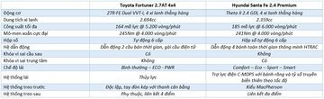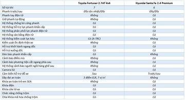 Trong khi Toyota Fortuner 2.7AT 4x4 chỉ trang bị các tiện ích khá cơ bản như hệ thống phanh ABS, EBD, BA, hệ thống cân bằng điện tử, hệ thống kiểm soát lực kéo chủ động, hỗ trợ khởi hành ngang dốc, hỗ trợ xuống dốc… như Hyundai Santa Fe 2.4 Premium.