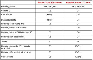 Danh sách trang bị an toàn trên X-Trail 2.0 V Series và Tucson 2.0 Diesel đều có các trang bị như ABS, EBD, BA, camera lùi, hệ thống hỗ trợ xuống dốc, khởi hành ngang dốc, kiểm soát lực kéo.. Nhưng X-Trail có thêm Cruise Cotrol, Hệ thống kiểm soát độ bám đường, hệ thống phanh chủ động hạn chế trượt bánh, kiểm soát khung gầm chủ động ACC. Đổi lại, nếu Tucson có 6 túi khí thì trên X-Trail chỉ có 4 túi khí, mẫu xe đến từ Nhật cũng không có cảm biến lùi, phanh tay điện tử.
