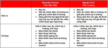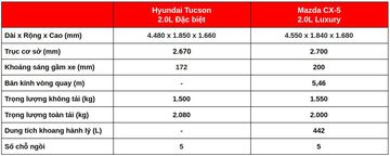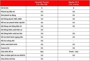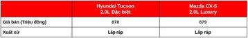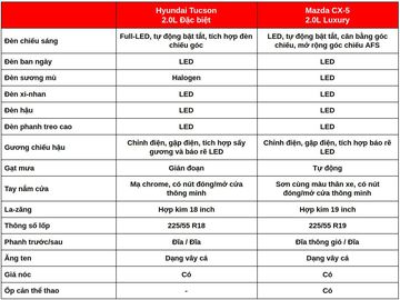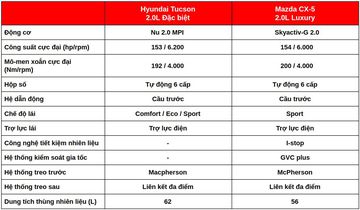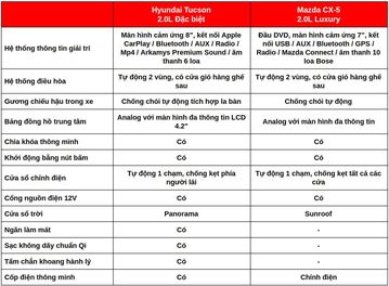 Hiện tại, Hyundai Tucson 2.0L Đặc biệt và Mazda CX-5 2.0L Luxury là hai phiên bản tương đồng nhau trong mức giá 880 triệu đồng. Đây cũng là hai phiên bản được trang bị đầy đủ với mức giá khá hợp lý, được nhiều người lựa chọn cho gia đình cũng như đi lại phục vụ công việc.