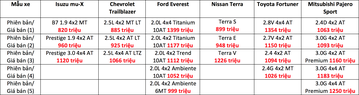Trong phân khúc, Isuzu mu-X vẫn là mẫu xe vô địch về giá bán khởi điểm cho một chiếc xe SUV 7 chỗ ngồi với cấu hình số sàn 1 cầu. Mazda CX-8 với giá khởi điểm từ 1,1 tỷ đồng chắc chắn sẽ không có tuỳ chọn hộp số sàn. Tuy nhiên, Ford Everest vẫn là mẫu xe có giá bán cao nhất với phiên bản Titanium 4x4 là 1,4 tỷ đồng.