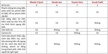 Trong khi đó, với danh sách các tính năng an toàn được đánh giá là vừa đủ, Honda Jazz và Toyota Yaris dễ dàng cân chỉnh mức giá hợp lý hơn mà vẫn đảm bảo được giá trị chung của xe. Riêng với Suzuki Swift, dù trang bị an toàn có phần kém hơn so với các đối thủ nhưng vẫn được nhiều chuyên gia đánh giá là hợp lý so với tầm giá mà mẫu xe này định vị.