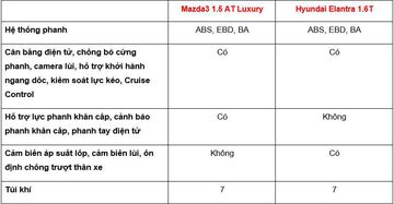 Trang bị an toàn trên Mazda3 Luxury và Hyundai Elantra 1.6T có thể nói là một chín một mười. Cả 2 đều có hệ thống phanh ABS, EBD, BA, hệ thống cân bằng điện tử, camera lùi, 7 túi khí... Mazda3 có thêm hệ thống hỗ trợ lực phanh khẩn cấp, cảnh báo phanh khẩn cấp, phanh tay điện tử... thì bù lại, Elantra cũng có thêm cảm biến áp suất lốp, cảm biến lùi, ổn định chống trượt thân xe.