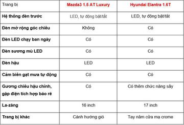 Mazda3 Luxury nhỉnh hơn khi được trang bị hệ thống thông tin giải trí với màn hình 8.8 inch, hệ thống âm thanh 8 loa, trên bản thể thao của Elantra là loại 7 inch và chỉ có 6 loa. Đổi lại, đối thủ đến từ Hàn có nhiều trang bị hiện đại hơn như: cửa sổ trời chỉnh điện, cốp mở điện từ xa, sạc không dây Qi, chức năng lọc khí ion cho hệ thống điều hòa.