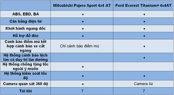 Về tính năng an toàn, hai phiên bản cao cấp nhất của Pajero Sport và Everest đều có trang bị khá tương đồng với đầy đủ các tính năng giúp người ngồi trong xe đạt được mức độ an toàn cao nhất. Ở Everest Titanium+ không có hệ thống chống tăng tốc ngoài ý muốn như trên Pajero, đây là một tính năng rất quan trọng cho những người sơ ý đạp nhầm chân ga.