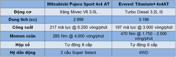 Nếu ai yêu thích cảm giác lái “bốc”, thể thao thì động cơ Diesel của Everest không phải là cái mà người ta muốn hướng đến. Động cơ xăng V6 3.0L hơn hẵn đối thủ đến 20 mã lực, đi cùng hộp số tự động 8 cấp tiên tiến bậc nhất phân khúc, khiến Pajero Sport không chỉ vận hành mạnh mẽ mà còn vô cùng nuột nà. Ngoài ra Pajero 2017 còn trang bị lẫy chuyển số trên vô lăng giúp người lái làm chủ tốc độ cực kì tốt khi muốn tăng tốc vượt mặt hoặc chạy off-road. Tuy nhiên, động cơ Diesel của Everest Titanium+ vẫn có những ưu điểm nhất định như sở hữu mô men xoắn cực đại lên đến 470 Nm tại số vòng tua thấp và khả năng tiết kiệm nhiên liệu cao.