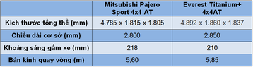 Xét các thông số ảnh hưởng đến không gian nội thất cùng sự di chuyển linh hoạt, có thể thấy Everest 2017 vượt trội hoàn toàn so với đối thủ nhờ sở hữu kích thước tổng thể cùng chiều dài cơ sở lớn. Điều này không chỉ mang lại một cái nhìn “bề thế” cho Everest, mà còn mang đến một khoang lái vô cùng rộng rãi. Ngược lại, dù không sở hữu vóc dáng bề thế như Everest nhưng Pajero Sport 2017 vẫn cho người ngồi bên trong một không gian thoáng đãng, kết hợp cùng khoảng sáng gầm xe cao 218mm và bán kính quay vòng nhỏ hơn 25cm so với đối thủ.