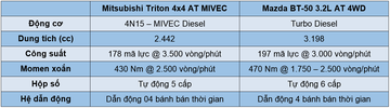 Nhờ được chia sẻ công nghệ từ Ford mà Mazda BT-50 3.2 AT 4WD có được “trái tim” vào loại mạnh mẽ hàng đầu phân khúc, 197 mã lực và 470 Nm đạt được ở mức vòng tua thấp, giúp xe có được sức kéo tốt dù “cân nặng” hơn hai tấn. Bù lại, lợi thế mà động cơ diesel tăng áp 4N15 mà Mitsubishi trang bị cho Triton MIVEC là khả năng vận hành ổn định, tiết kiệm và nhất là sự bền bỉ trứ danh của thương hiệu Nhật Bản, cộng thêm tự trọng bản thân chỉ hơn 1.800 đôi chút giúp Triton dễ dàng tăng tốc vượt mặt khi cần thiết.