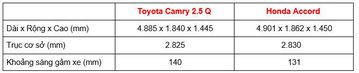 Kích thước tổng thể và chiều dài cơ sở của Accord nhỉnh hơn đôi chút so với Camry nhưng không thực sự đáng kể. Trong khi đó, khoảng sáng gầm của Camry cao hơn Accord, giúp vận hành linh hoạt hơn đôi chút trên các đoạn đường gồ ghề.