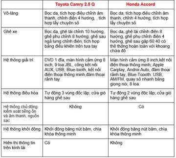 So về hệ thống thông tin giải trí, cả 2 đều có màn hình cảm ứng 8 inch nhưng Camry 2.5Q nhỉnh hơn với hệ thống âm thanh 9 loa JLB (Accord chỉ 8 loa). Cả 2 đều cho phép kết nối điện thoại thông minh, chức năng đàm thoại rảnh tay...