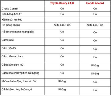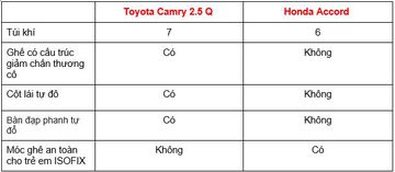 Trên 2 xe đều có các trang bị an toàn như Cruise Control, cân bằng điện tử, kiểm soát lực kéo, chống bó cứng phanh, phân phối lực phanh điện tử, phanh khẩn cấp, hỗ trợ khởi hành ngang dốc, camera lùi, cảm biến lùi, cảm biến va chạm góc trước, cảnh báo áp suất lốp... nhưng danh sách trang bị an toàn trên Accord có phần lép vế hơn so với Camry khi ít hơn 1 túi khí, không có hệ thống cảnh báo điểm mù, cảnh báo phương tiện cắt ngang, ghế cấu trúc giảm chấn thương cổ, cột lái tự đổ, bàn đạp phanh tự đổ.