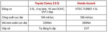 Bước sang thế hệ mới, nếu như Camry vẫn trung thành với động cơ cũ thì Accord đã được lắp động cơ tăng áp 1.5L, cho công suất 188 mã lực, mạnh mẽ hơn so với động cơ 2.5L và 184 mã lực trên Camry. Ngoài ra, Accord còn được trang bị hộp số vô cấp CVT nên khi di chuyển trong nội thị đông đúc sẽ đỡ vất vả hơn so với loại tự động 6 cấp trên Camry.