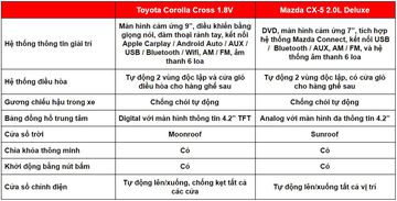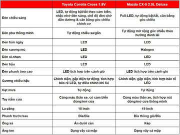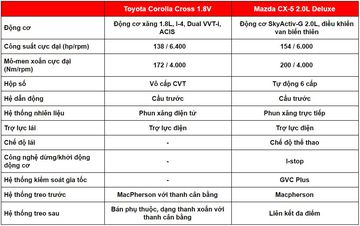 Chênh lệch giá lăn bánh thể hiện rõ nhất qua 2 phiên bản Toyota Corolla Cross 1.8V và Mazda CX-5 2.0L Deluxe với 2 mức giá niêm yết lần lượt 820 và 819 triệu đồng. Vậy giữa hai dòng xe này có những khác biệt nào, và đâu là lựa chọn đáng cân nhắc hơn, chúng ta sẽ cùng so sánh nhanh trang bị của cả hai dòng xe.