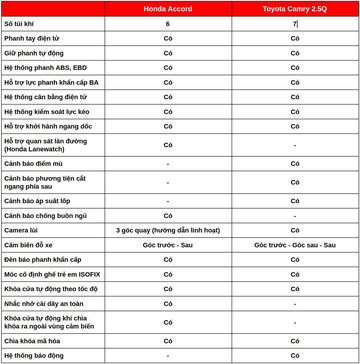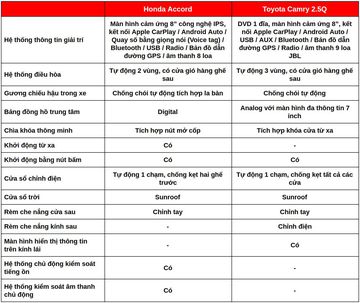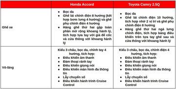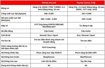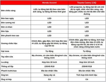 Toyota Camry và Honda Accord không có quá nhiều khác biệt về trang bị tiện nghi và tính năng an toàn. Mẫu xe của Toyota có không gian ngồi rộng hơn, tính thương hiệu tốt hơn và giá bán thấp hơn gần 100 triệu đồng. Đây là những lợi thế cạnh tranh nổi bật nhất, giúp Camry liên tục vượt đối thủ về doanh số. Trong khi đó, Honda Accord có thiết kế đẹp, khả năng vận hành ấn tượng, nhưng giá bán lại không dành cho số đông. Đây là lựa chọn dành cho những người muốn một chiếc sedan khác biệt, thích cầm lái và gu thẩm mỹ cá tính hơn.