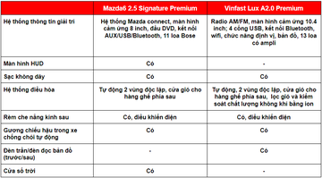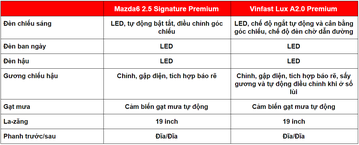 So với Mazda6, Vinfast Lux A2.0 được trang bị động cơ mạnh mẽ hơn, danh sách trang bị tiện nghi hậu hĩnh hơn nhưng lại thua đối thủ về mặt tuổi đời thương hiệu, giá bán cũng đắt hơn.