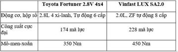 Trang bị động cơ nhỏ hơn nhưng Vinfast LUX SA2.0 cho công suất mạnh hơn Fortuner 2.8V 4x4 tới 54 mã lực và 10Nm. Một sự chênh lệch khá lớn, giúp mẫu xe có khả năng vận hành mạnh mẽ hơn trên mọi nẻo đường.