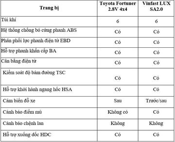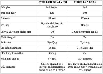 Bảng liệt kê về các trang bị tiện nghi trên 2 mẫu SUV cho thấy, mặc dù trên Fortuner 2.8V 4x4, vô lăng được tích hợp thêm lẫy chuyển số để tạo sự thuận tiện hơn trong quá trình sử dụng, tuy nhiên mẫu xe đến từ Nhật vẫn nghèo nàn hơn về mặt trang bị. Trong khi đó, Vinfast LUX SA2.0 hấp dẫn hơn đáng kể bởi màn hình thông tin giải trí 10.4 inch, hệ thống âm thanh 8 loa, đèn trang trí nội thất, gương chiếu hậu tự động điều chỉnh khi lùi và bộ mâm xe kích thước lớn hơn (19 inch).