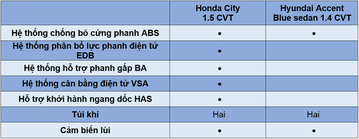 Vận hành cùng động cơ mạnh mẽ, cùng trang bị hàng loạt các tính năng, do đó không quá khó hiểu vì sao Honda City nhận được nhiều ưu ái. Nếu như Honda City trang bị hàng loạt tính năng an toàn mà không đối thủ nào ở phân khúc có được như hệ thống cân bằng điện tử VSA, hỗ trợ khởi hành lưng chừng dốc HAS, bên cạnh hệ thống phanh ABS/EBD/BA và 4 cảm biến phía sau. Trong khi đó Accent chỉ trang bị những tính năng an toàn phổ thông vẫn còn kém xa mẫu xe Nhật Bản.