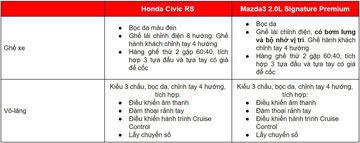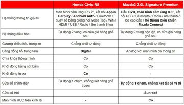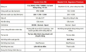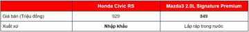 Mazda3 2.0L Signature Premium lắp ráp trong nước nên giá thành rẻ hơn, trong khi đó mẫu xe Honda Civic RS được đánh giá cao khi nhập khẩu nguyên chiếc từ Thái Lan