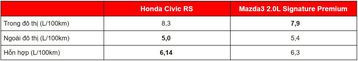 Honda Civic RS cũng cho thấy khả năng tiết kiệm nhiên liệu khá tốt với tiêu hao chỉ 6,14 L/100km trong điều kiện hỗn hợp và 5 L/100 km với điều kiện ngoài đô thị. Trong khi đó Mazda3 2.0L Signature Premium lại nhỉnh hơn khi di chuyển trong đô thị với tiêu hao 7,9 L/100 km.