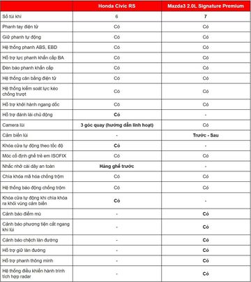 Honda Civic RS và Mazda3 2.0L Signature Premium đều trang bị khá đầy đủ các tính năng an toàn tiêu chuẩn như hệ thống phanh ABS, EBD, BA, cân bằng điện tử... Tuy nhiên với lợi thế lắp ráp trong nước, Mazda3 2.0L Signature Premium được bổ sung các tính năng an toàn nâng cao như cảnh báo điểm mù, cảnh báo phương tiện cắt ngang phía sau, cảnh báo chệch làn đường, hỗ trợ giữ làn, phanh thông minh và điều khiển hành trình tích hợp radar.