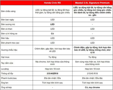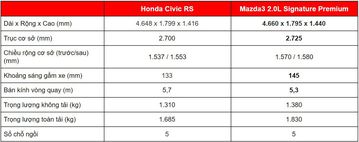 Để có những so sánh tổng quan và khách quan nhất, bài so sánh lựa chọn 2 phiên bản cao cấp nhất của cả 2 mẫu xe có mức giá trên dưới 900 triệu đồng là Honda Civic RS và Mazda3 2.0L Signature Premium. Vậy đâu là dòng xe đáng cân nhắc hơn, chúng ta cùng theo dõi các bảng so sánh thông số theo các hạng mục dưới đây:
