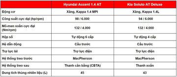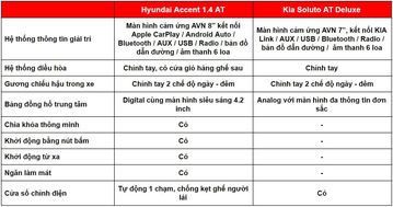 Với giá bán cao hơn 72 triệu đồng, Hyundai Accent AT tiêu chuẩn 2021 sở hữu những công nghệ hiện địa hơn hẳn đối thủ đồng hương Kia Soluto AT Deluxe. Hyundai Accent AT tiêu chuẩn 2021 sẽ phù hợp với các khách hàng dùng xe cho gia đình với khoang hành khách rộng rãi, trang bị tiện nghi đầy đủ. Trong khi đó, Kia Soluto AT Deluxe sẽ là lựa chọn tuyệt vời dành cho các khách hàng mua xe để kinh doanh, phục vụ nhu cầu công việc với trang bị đủ dùng, giá thành và chi phí sử dụng thấp.